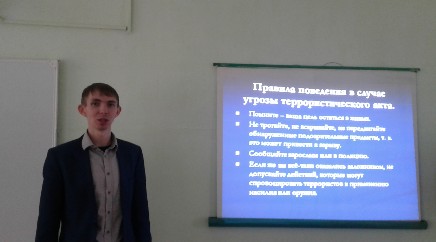 Затем лекцию продолжил заместитель директора по воспитательной работе Николаев Виктор Валерьевич, он познакомил учащихся с правилами поведения в случае угрозы террористического акта, провел беседу как не стать жертвами теракта.